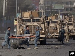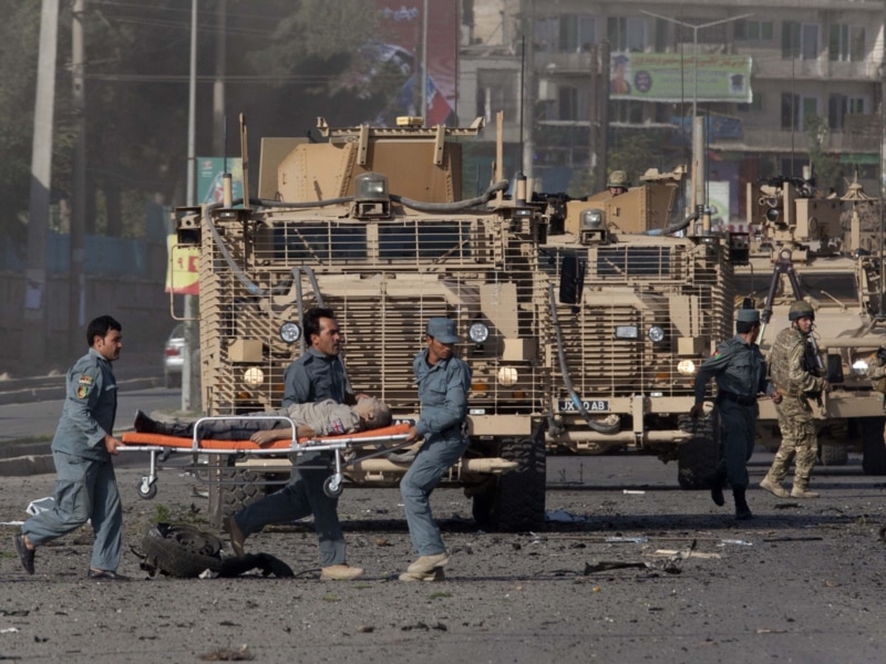 Security forces carry a wounded British man at the site of a suicide attack outside the British Council in Kabul.