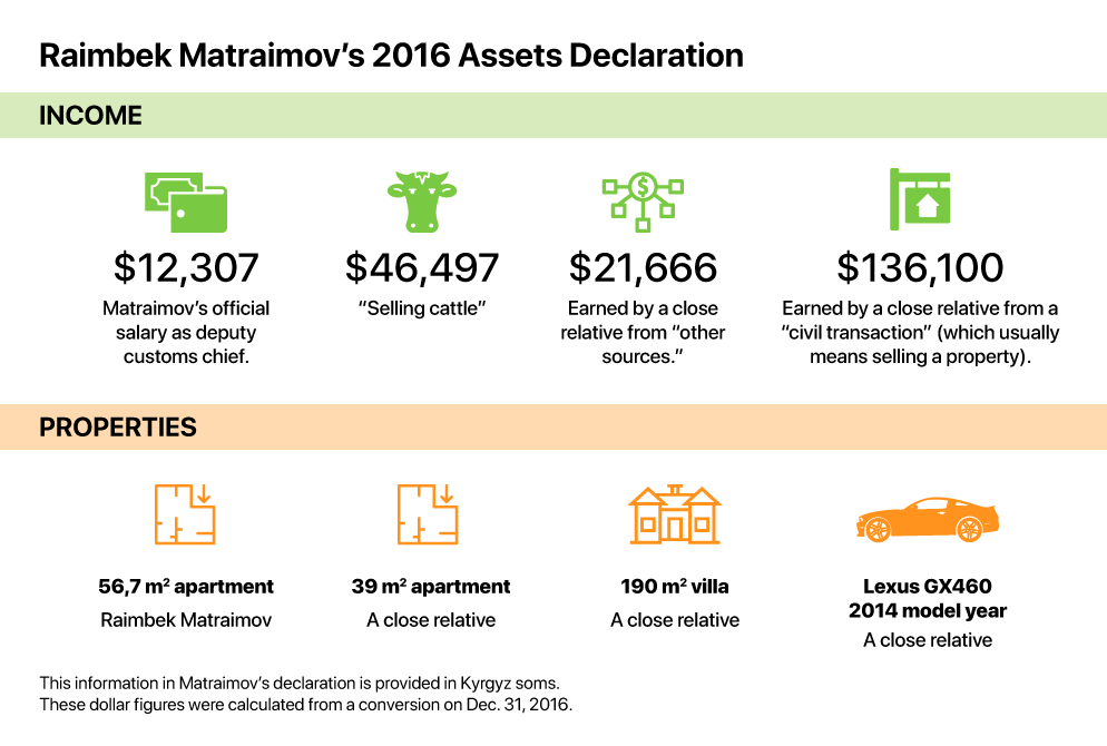 Matraimov’s 2016 asset declaration does not paint a picture of a family that could afford a $12 million investment. Click to enlarge.