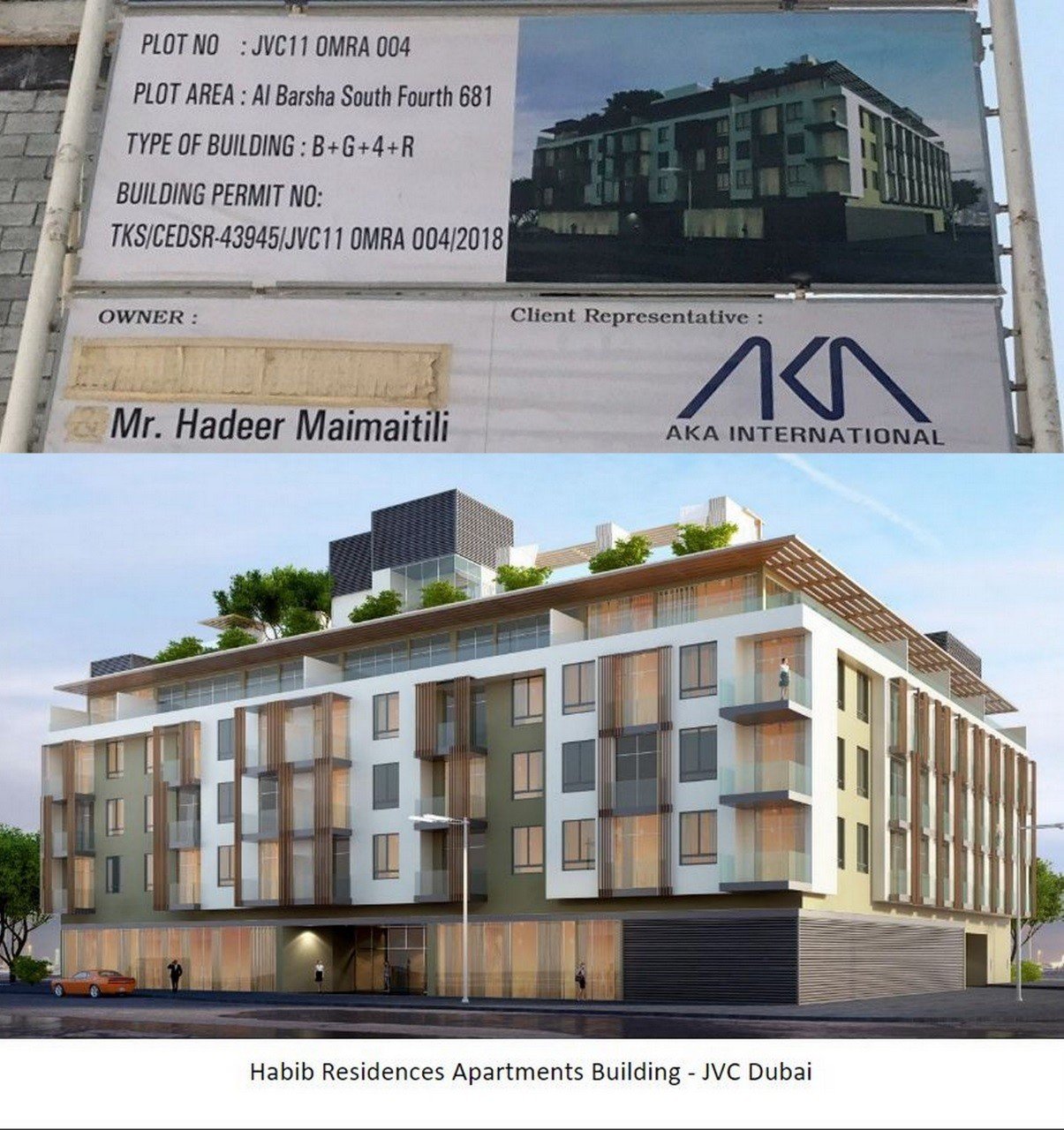 The sign also features an architectural rendering of the finished building that is nearly identical to one included on the resume of Alexander Karmeinsky, a German architect who has done other work for the Abdukadyr family. The development is identified as Habib Residences Apartments building -- JVC Dubai, and is described as an 82-unit residential building with retail on the ground floor, a gym, “and rooftop pools directly facing the new Jumeirah Village Circle shopping mall.”