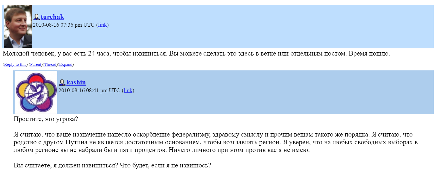 A screen shot of Turchak’s demand for an apology from Kashin, who responds: “Excuse me, is that a threat?” (web.archive.org)