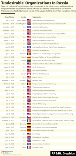 The "undesirable" organization law, adopted in May 2015 and since updated, was part of a series of regulations pushed by the Kremlin that squeezed many nonprofit and nongovernmental organizations that received funding from foreign sources -- mainly from Europe and the United States.