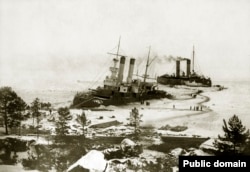 The Yermak (right) crunching through sea ice to rescue a trapped Russian battleship in 1900. The steam-powered icebreaker was initially driven by four propellers -- three at the rear and one in the front -- setting the stage for the further development of massively powerful vessels that could open icy sailing routes.