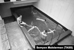 Crew members relaxing inside a heated swimming pool aboard the Arktika in 1977.