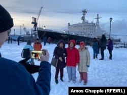 Tourists from Hong Kong pose in front of the Lenin in Murmansk in 2019. The vessel, which suffered two dangerous malfunctions with its reactor during her career, was retired from service in 1989 and now serves as a museum ship.