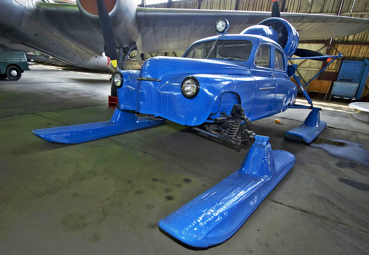 What might be the world’s funkiest-looking “aerosled” was created in 1959 when Soviet engineers bolted the engine from a Yak-12 airplane onto the back of a GAZ M20 sedan, then fitted the craft with Teflon-coated skis.