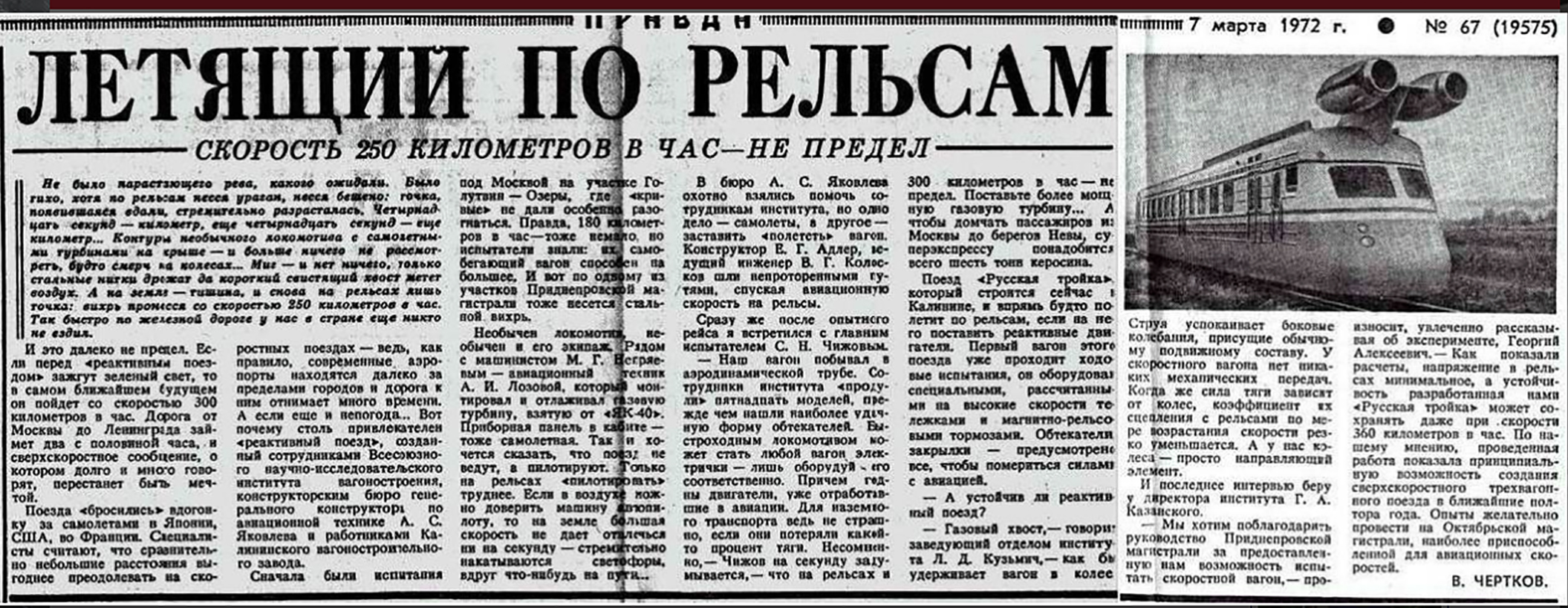 The experimental train’s career peaked in 1972 after it reportedly topped 250 kilometers per hour on a stretch of straight railway and had a gushing report on its performance written up in Pravda, the propaganda mouthpiece of the Communist Party.