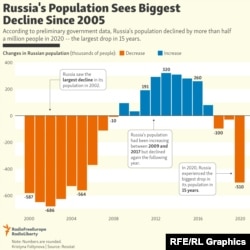 Russia’s population declined by more than 500,000 people in 2020, by far the steepest drop in over a decade and a blow to Putin’s goal of robustly reversing the post-Soviet demographic decline.