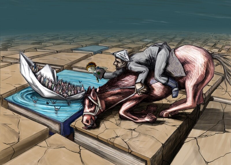 A satirical cartoon called “The Population Temptation of Ahmadinejad,” which lampoons the Iranian president's "subsidy" policies aimed at encouraging an increase in the country's birth rate.