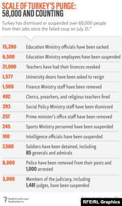 Around 50,000 soldiers, police, judges, civil servants, and teachers have been rounded up, sacked, or suspended since the military coup attempt.
