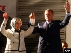 Turkish Prime Minister Recep Tayyip Erdogan (right), accompanied by wife Emine, greets supporters at AKP headquarters in Ankara on June 12.