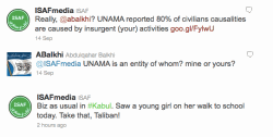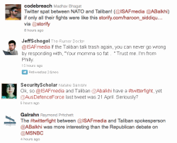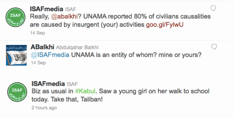 Subsequent Twitter hostilities began when @ISAFmedia tweeted: “Re: Taliban spox on #Kabul attack: the outcome is inevitable. Question is how much longer will terrorists put innocent Afghans in harm's way?”