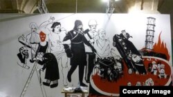 The painting, a mural measuring 11 meters by 5 meters, showed a flaming nuclear reactor with priests and judges semisubmerged in a vat of red liquid. A car that appeared to be carrying officials was shown plunging into the vat -- likely a reference to the numerous traffic accidents caused by officials in the country. A hodgepodge of other figures were grouped alongside, including what appeared to be the image of Iryna Krashkova, the woman who accused two police officers and a civilian of beating and raping her last month. Her case has prompted a wave of protests.
