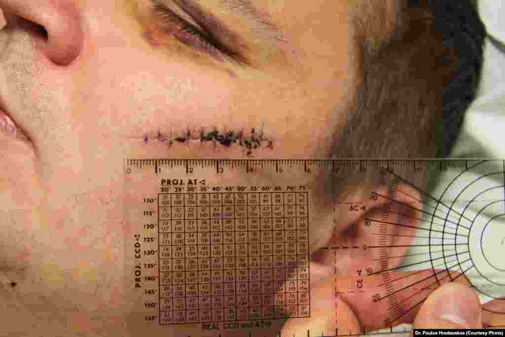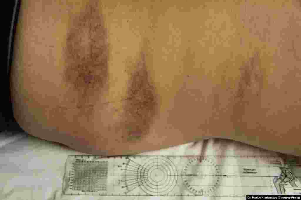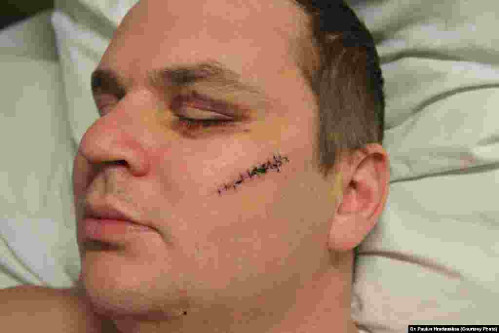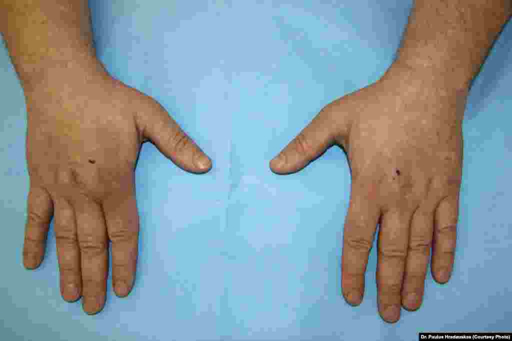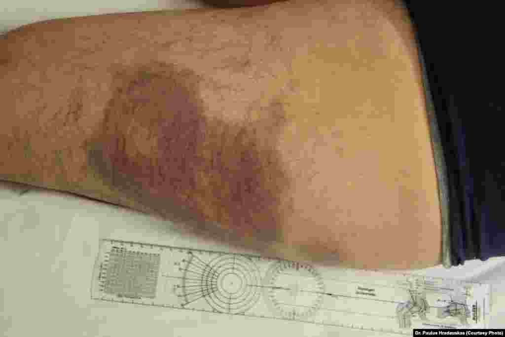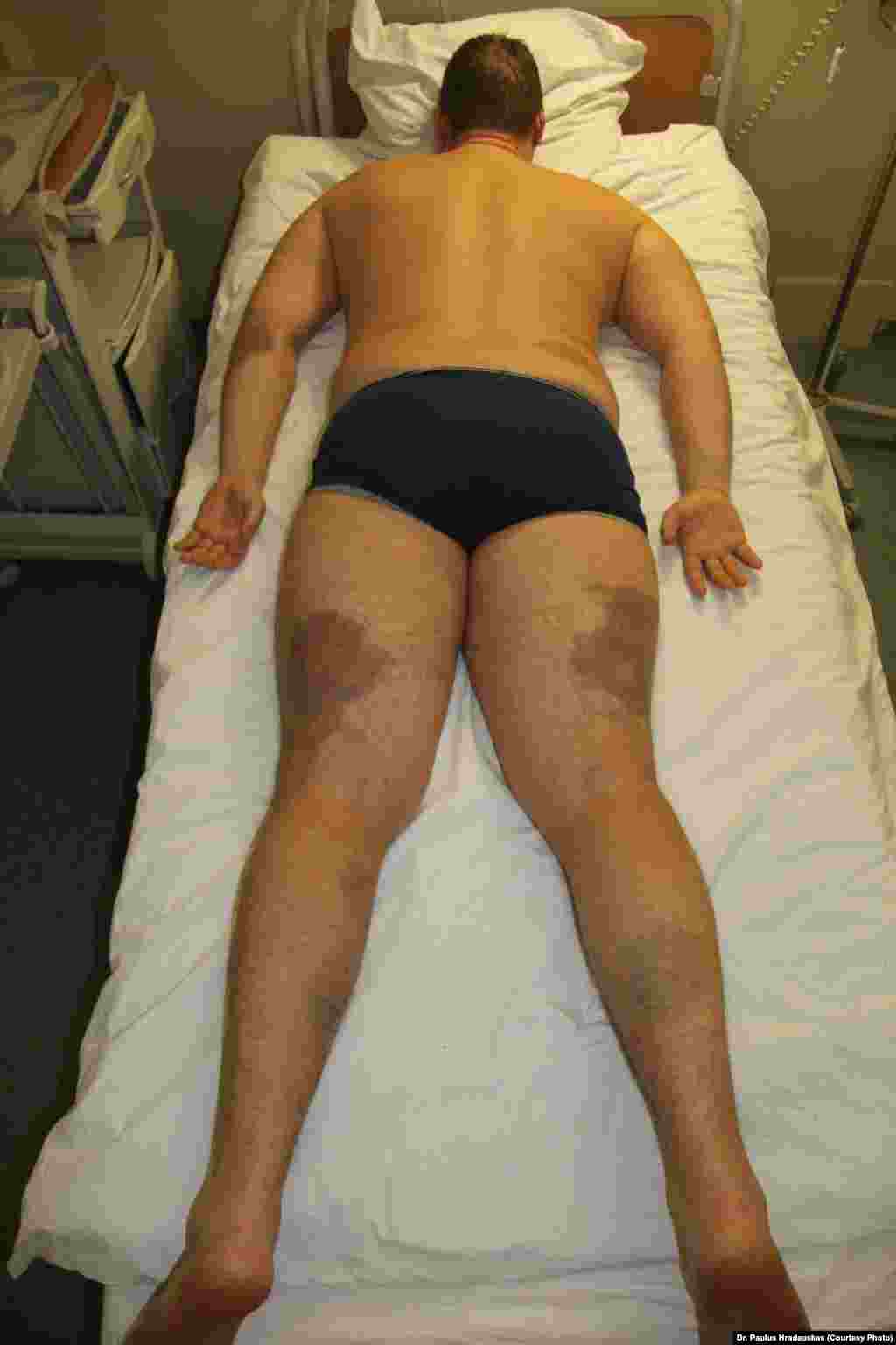 Ukrainian antigovernment activist Dmytro Bulatov has described being abducted in Kyiv and tortured by his captors for a week. After his release, he traveled to Lithuania for treatment of his injuries. Speaking at a press conference on February 6, he said that he was beaten "hard and professionally" and interrogated every day. These photographs, provided by Bulatov's doctors in Lithuania, show the injuries he suffered.