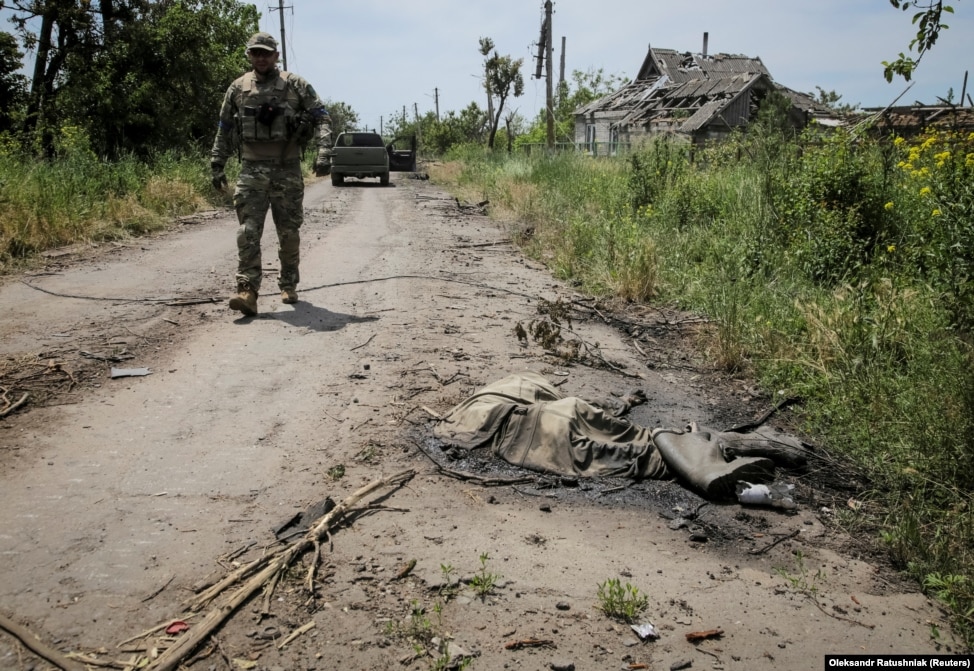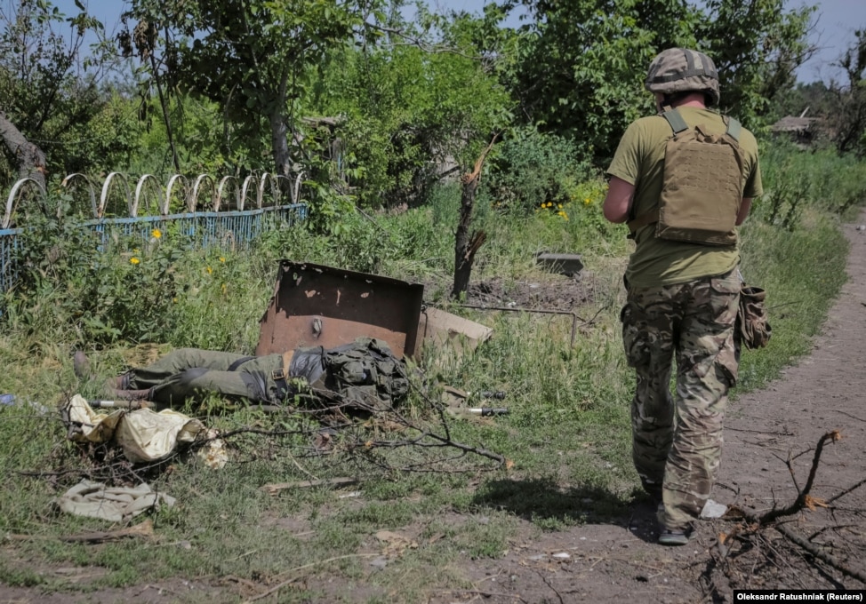 A Ukrainian service member walks near the body of a Russian soldier.