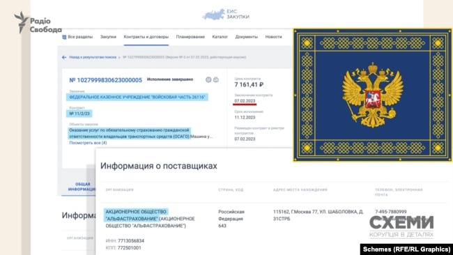 A February 7, 2023, Goszakupki document states that the company will cover four vehicles from military unit 26116 – a mini-bus, truck, plow, and jeep -- for 7,161.41 rubles ($90). The contract expires by the end of 2023.