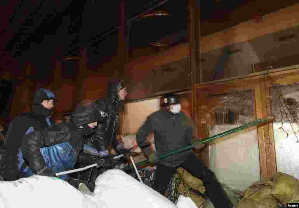 Opposition activists guard Ukrainian House after seizing control of the building.
