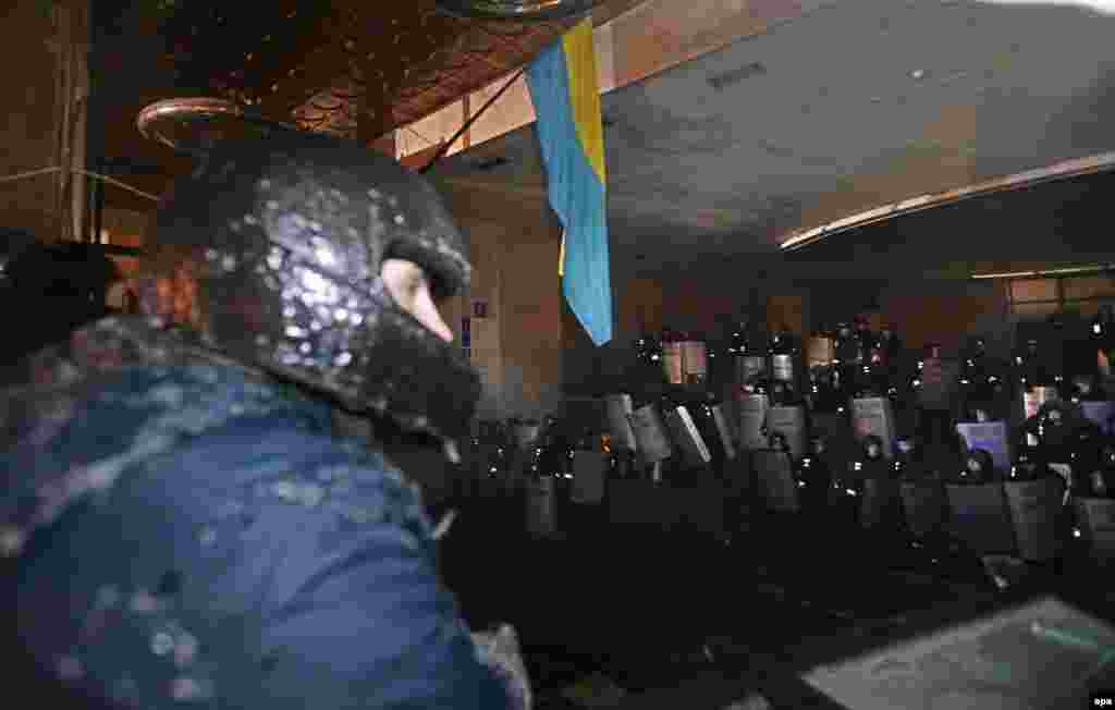 Protesters storm Ukrainian House, where dozens of riot police were based during an antigovernment protest in downtown Kyiv.