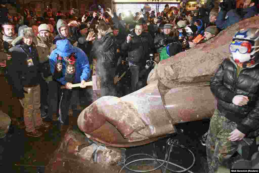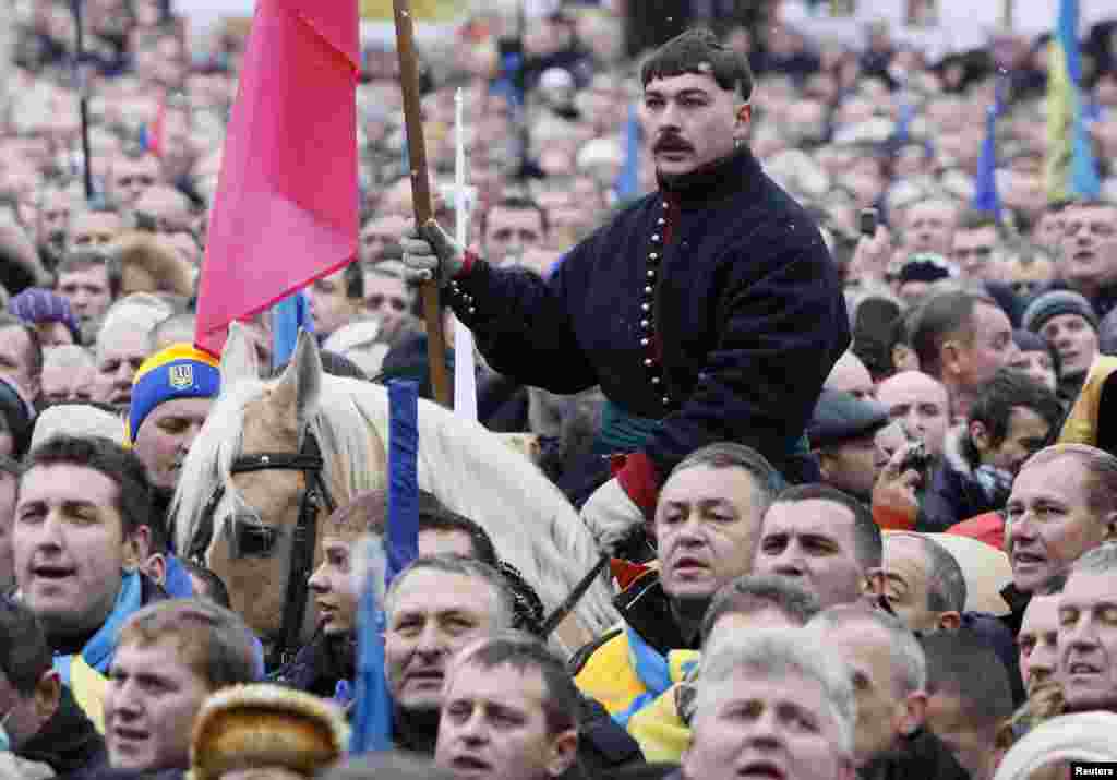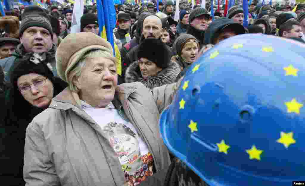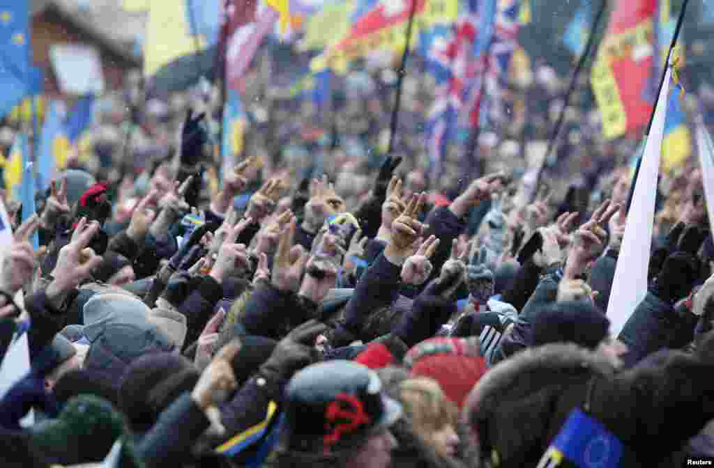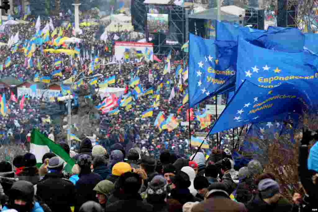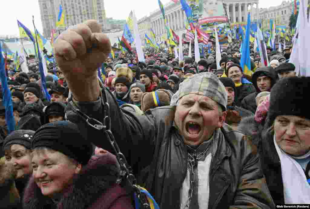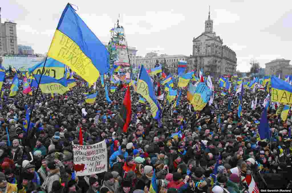 Weeks into antigovernment demonstrations sparked by Ukrainian President Viktor Yanukovych's decision to scrap plans to pursue closer ties with the European Union, hundreds of thousands of protesters gathered in Kyiv's Independence Square on December 8 to demand his resignation and fresh elections. (11 PHOTOS)