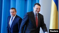 Polish Foreign Minister Sikorski (right) and Ukrainian counterpart Andriy Deshchytsya are meeting in Kyiv.
