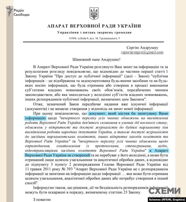The parliamentary administration, its bureaucratic apparatus, also could not help. A month after Schemes submitted a request for information, a staff member responded that the administration must first “summarize all the facts” related to the restrictions and then “analyze it.” Stefanchuk later said the inquiry would be answered.