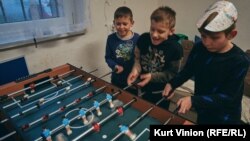 "It was horrible. Cold, damp, and dark. We were all scared," Hrishanovich told RFE/RL in the cramped but inviting confines of the recreation center on the ground floor of the dormitory. The walls are adorned by drawings, many in sky blue and yellow, Ukraine's national colors.