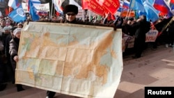 A man holds a map of the Soviet Union during a rally to support Russian-speakers living in Crimea and Ukraine, in the center of the Siberian city of Krasnoyarsk.