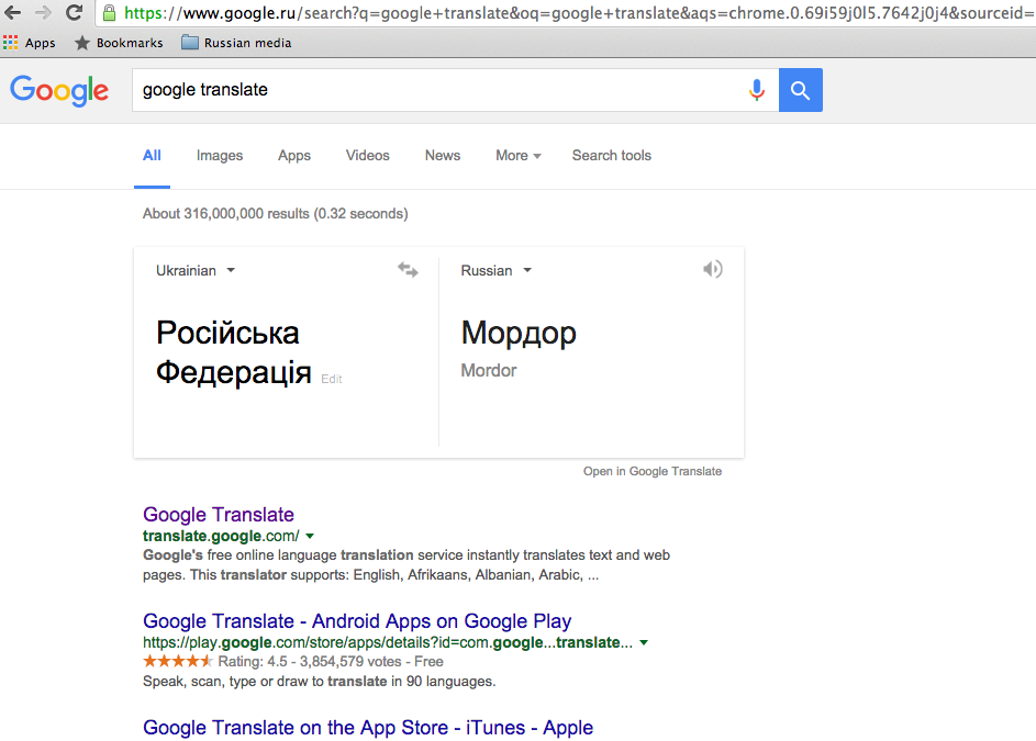 On January 5, for instance, "Russian Federation" in Ukrainian (Російська Федерація) was being translated as "Mordor," the fictional realm occupied and controlled by evil necromancer Sauron in J.R.R. Tolkien's epic, The Lord Of The Rings.
