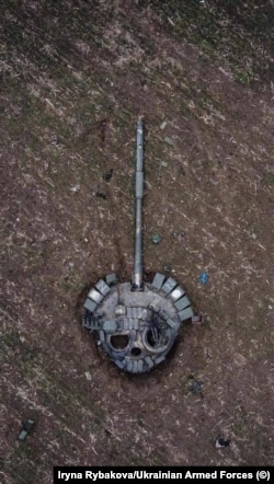 The above image of a skull-like turret from a destroyed Russian tank, the 38-year-old explains, was made with a drone in March after Ukrainian troops had recaptured the village of Husarivka, in the Kharkiv region, after a bitter fight.