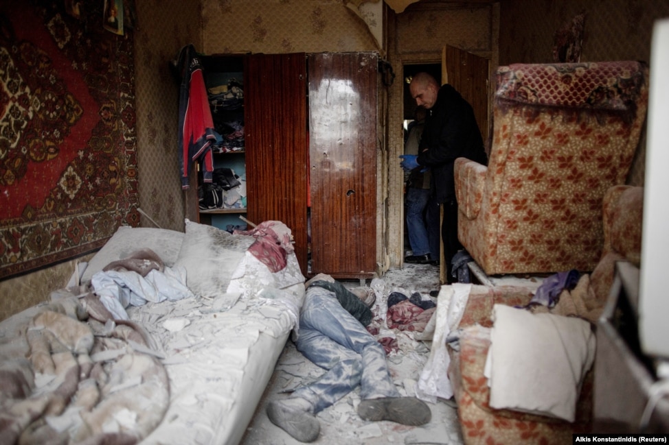 A Ukrainian emergency worker stands over the body of a 41-year-old resident who was killed during shelling that tore through his apartment in Kharkiv on April 13.