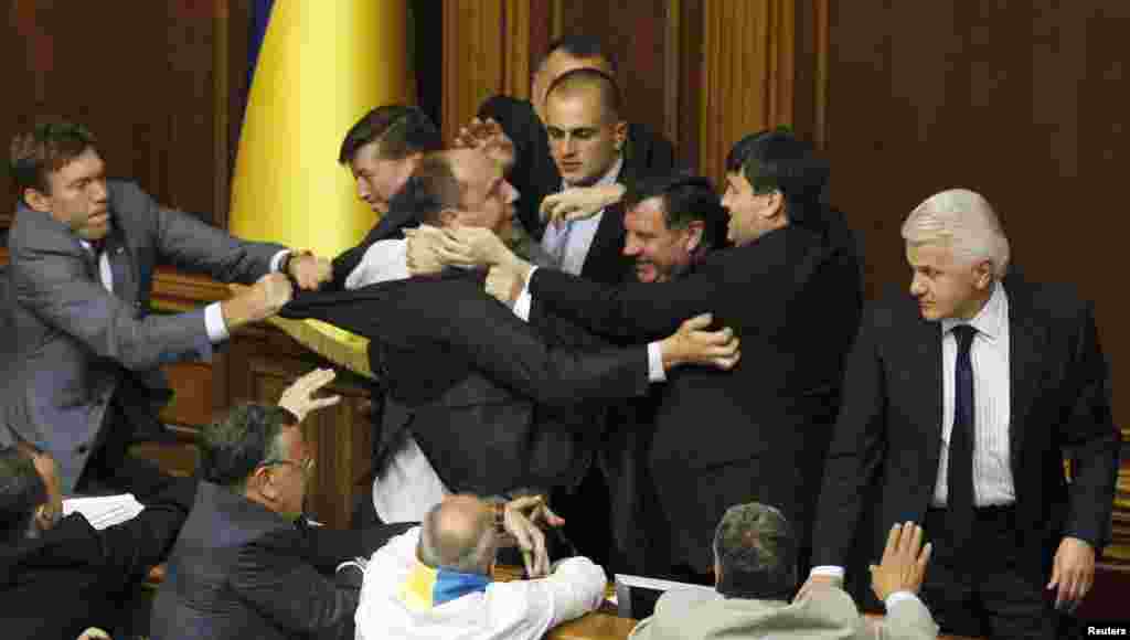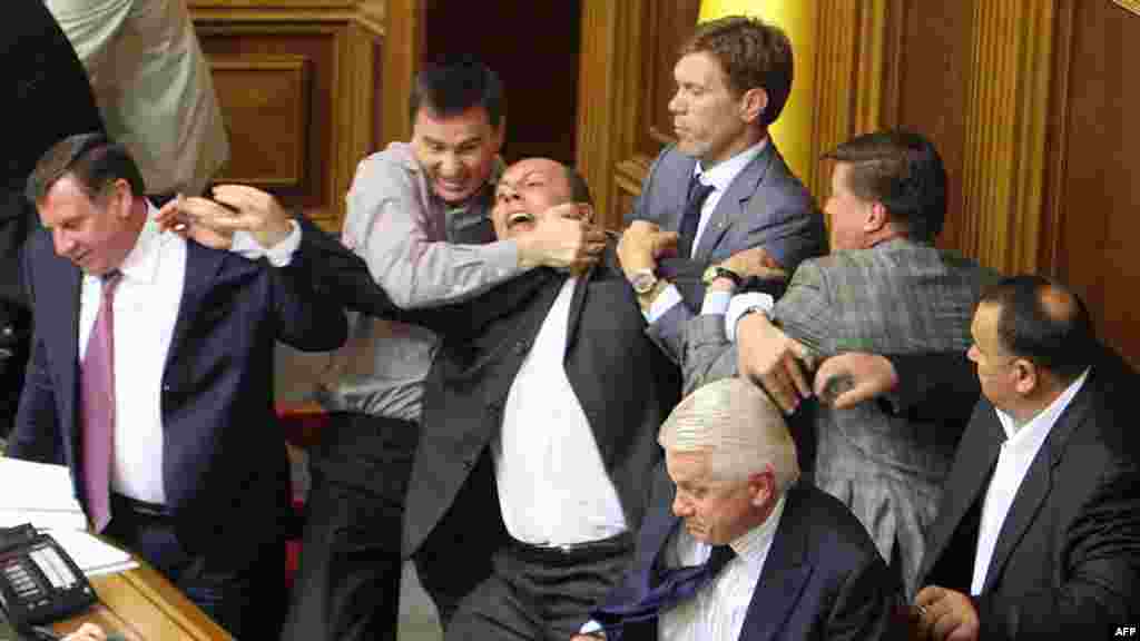 A fistfight erupted in the Ukrainian parliament during debate on a draft law on languages, which recommends introducing Russian as the second official language in 13 of 27 regions of Ukraine. The fight broke out between members of the pro-Western opposition and lawmakers from President Viktor Yanukovych's party, which bases its support in Ukraine's Russian-speaking east.