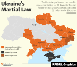 Kyiv imposed martial law in 10 of its 27 regions for 30 days on November 28 after Russian forces fired on Ukrainian ships and seized 23 sailors in the Black Sea off the coast of the Russian-controlled Crimean Peninsula.