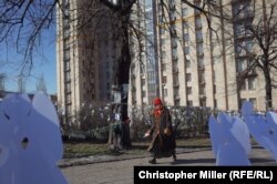 KYIV -- Olha Pasko and Valentina Riklyvska shed solemn tears as they hang paper angels on a hedgerow running along Kyiv's Institutska Street, the site of a bloody and decisive confrontation exactly five years ago between pro-democracy protesters and security forces during Ukraine's Euromaidan uprising.