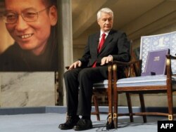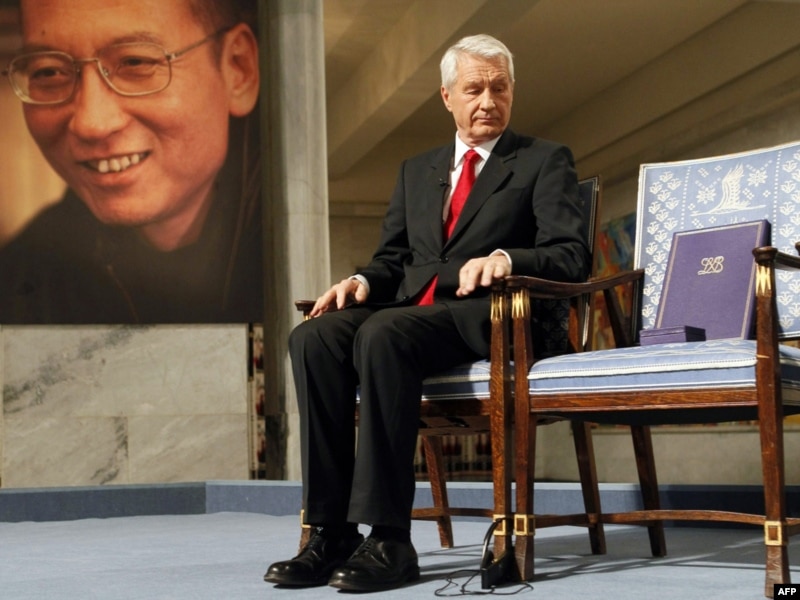 The chairman of the Nobel Committee, Thorbjoern Jagland, looks down at the vacant chair of Nobel Laureate Liu Xiaobo (portrait at left) during the Nobel ceremony on December 10.