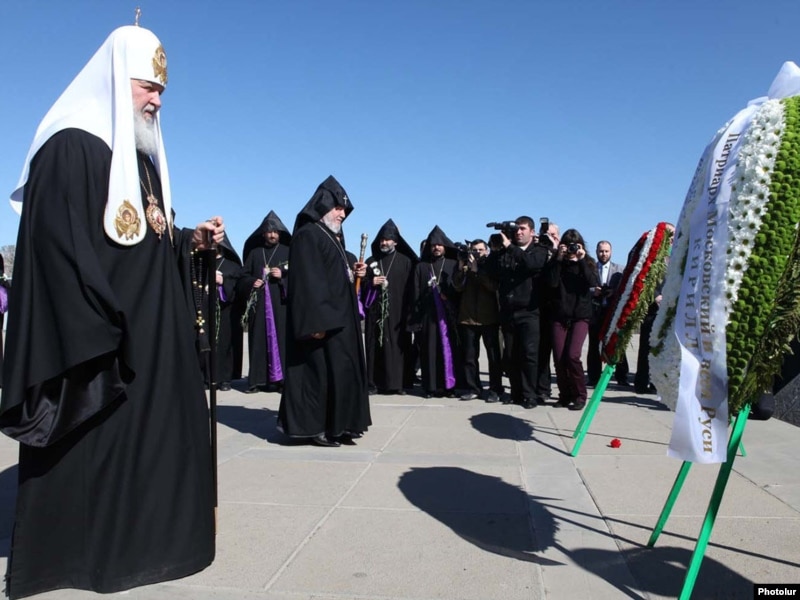 Earlier this month, Turkey withdrew its ambassadors to Washington and Stockholm after the U.S. House Foreign Affairs Committee and the Swedish parliament passed the nonbinding resolutions. Parliaments in several other countries have also recognized the killings as genocide in the past. One is Russia, whose Orthodox Patriarch Kirill laid wreaths at Yerevan's Armenian Genocide Monument today and delivered commemoration services in the victims' memory.