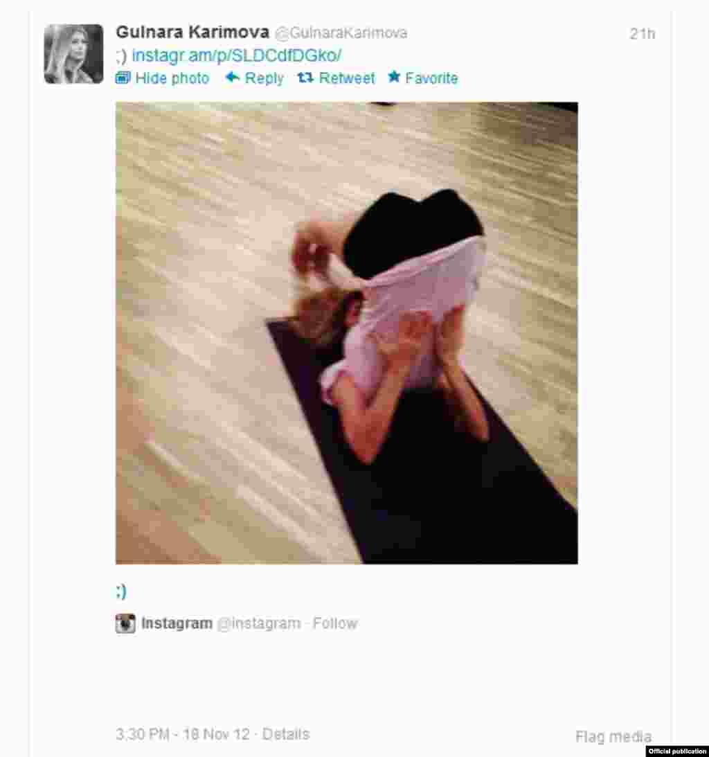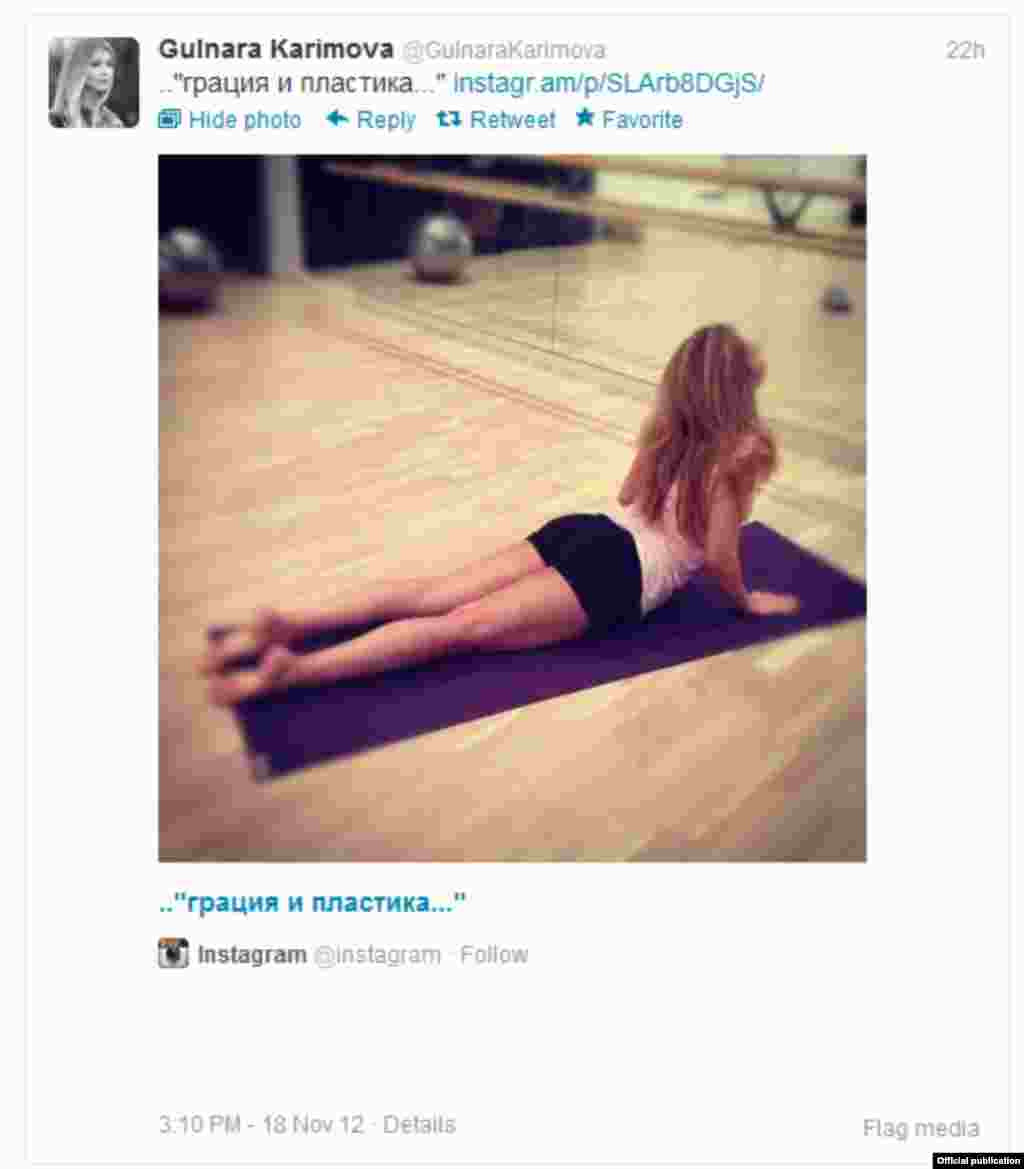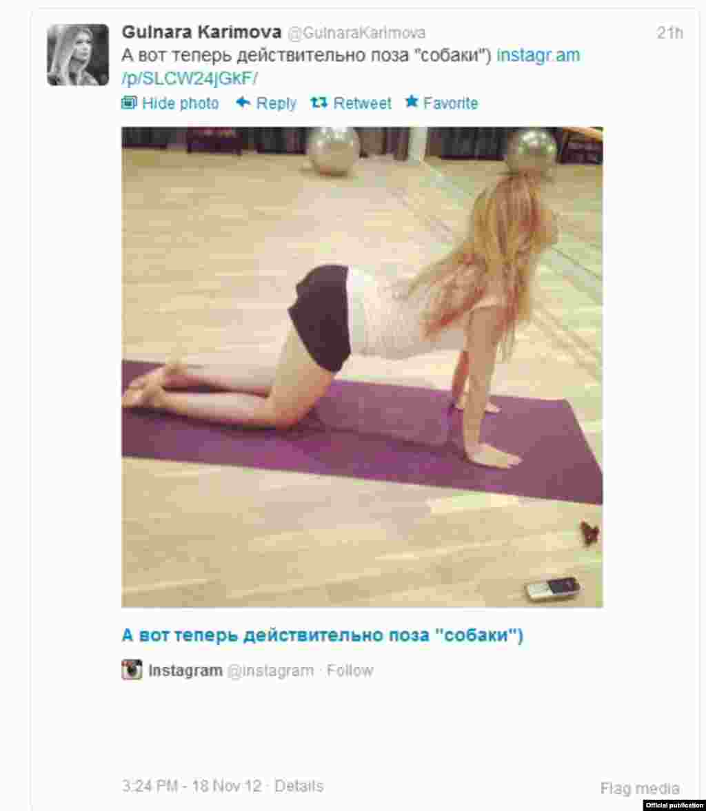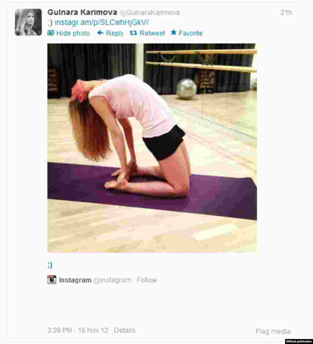 The eldest daughter of authoritarian Uzbek President Islam Karimov is also a fashion designer, a jewelry maker, a pop singer, a diplomat, a UN envoy, and a screenwriter. But in her latest effort in self-promotion, Karimova took to Twitter (@gulnarakarimova) to promote the benefits of yoga and to personally demonstrate some of the discipline's more common positions -- the Downward Facing Dog, the Plow, the Cobra, and the Angry Cat, among others. While some reactions on Twitter welcomed her efforts, her skimpy workout clothes and the sexual nature of some of the poses stretched the boundaries of propriety in the Muslim country, offending many others.