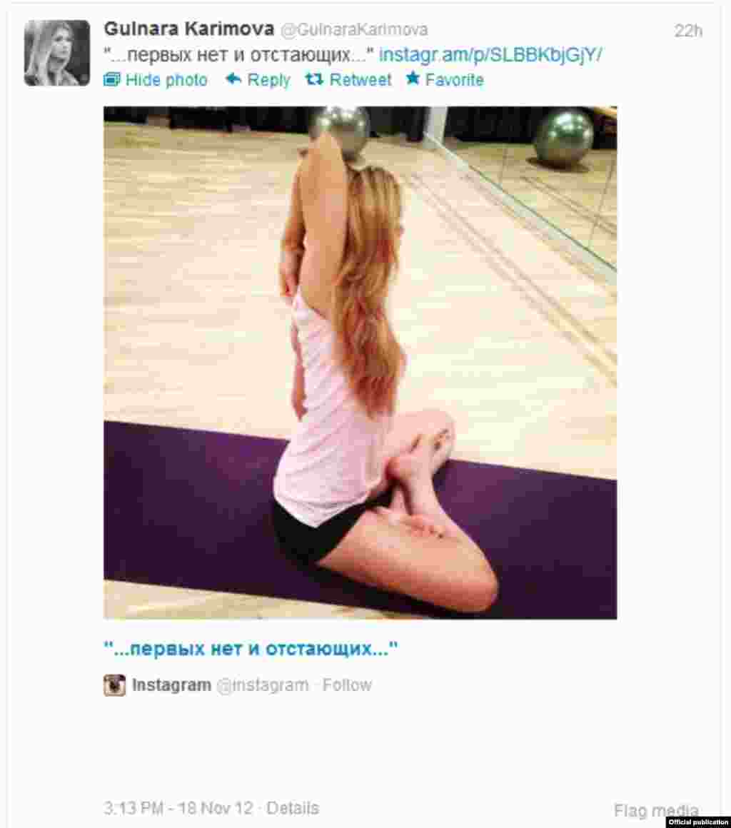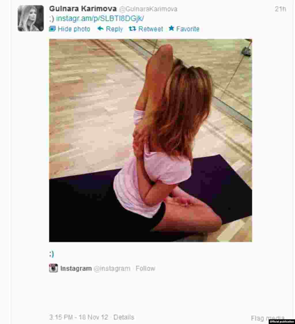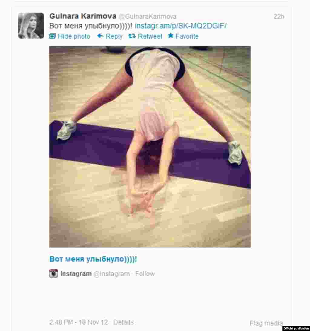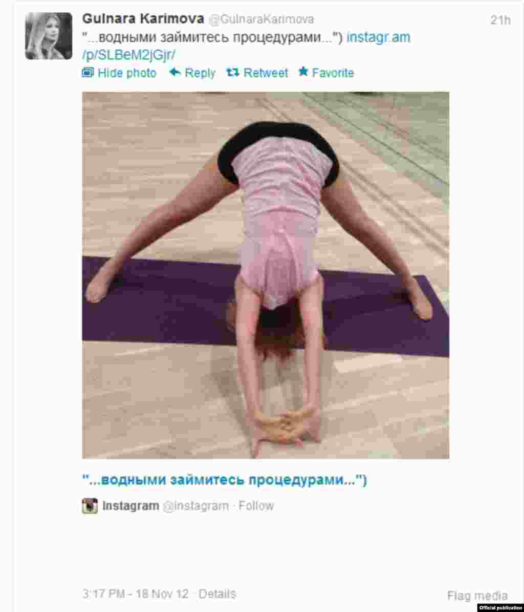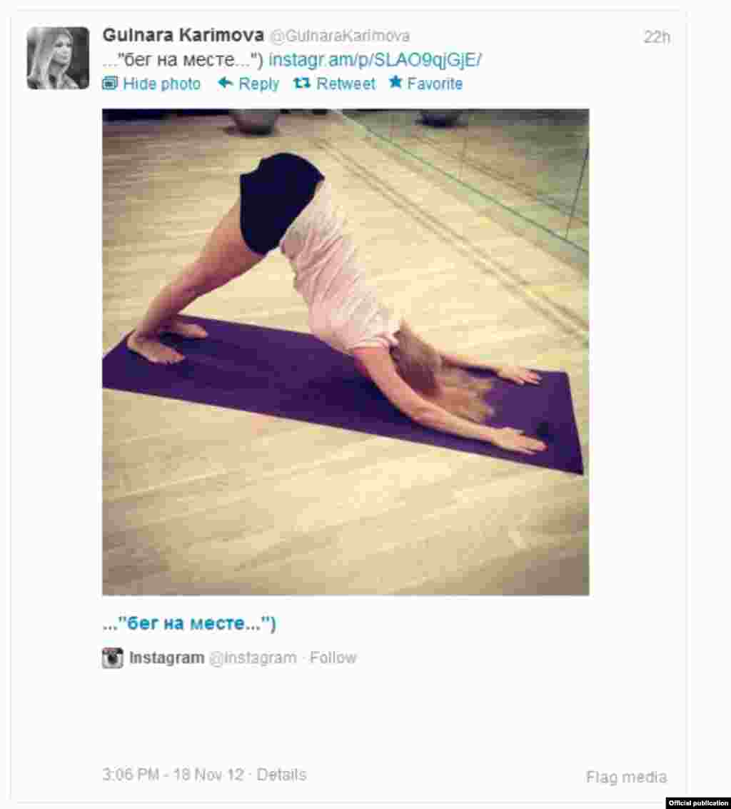The eldest daughter of authoritarian Uzbek President Islam Karimov is also a fashion designer, a jewelry maker, a pop singer, a diplomat, a UN envoy, and a screenwriter. But in her latest effort in self-promotion, Karimova took to Twitter (@gulnarakarimova) to promote the benefits of yoga and to personally demonstrate some of the discipline's more common positions -- the Downward Facing Dog, the Plow, the Cobra, and the Angry Cat, among others. While some reactions on Twitter welcomed her efforts, her skimpy workout clothes and the sexual nature of some of the poses stretched the boundaries of propriety in the Muslim country, offending many others.