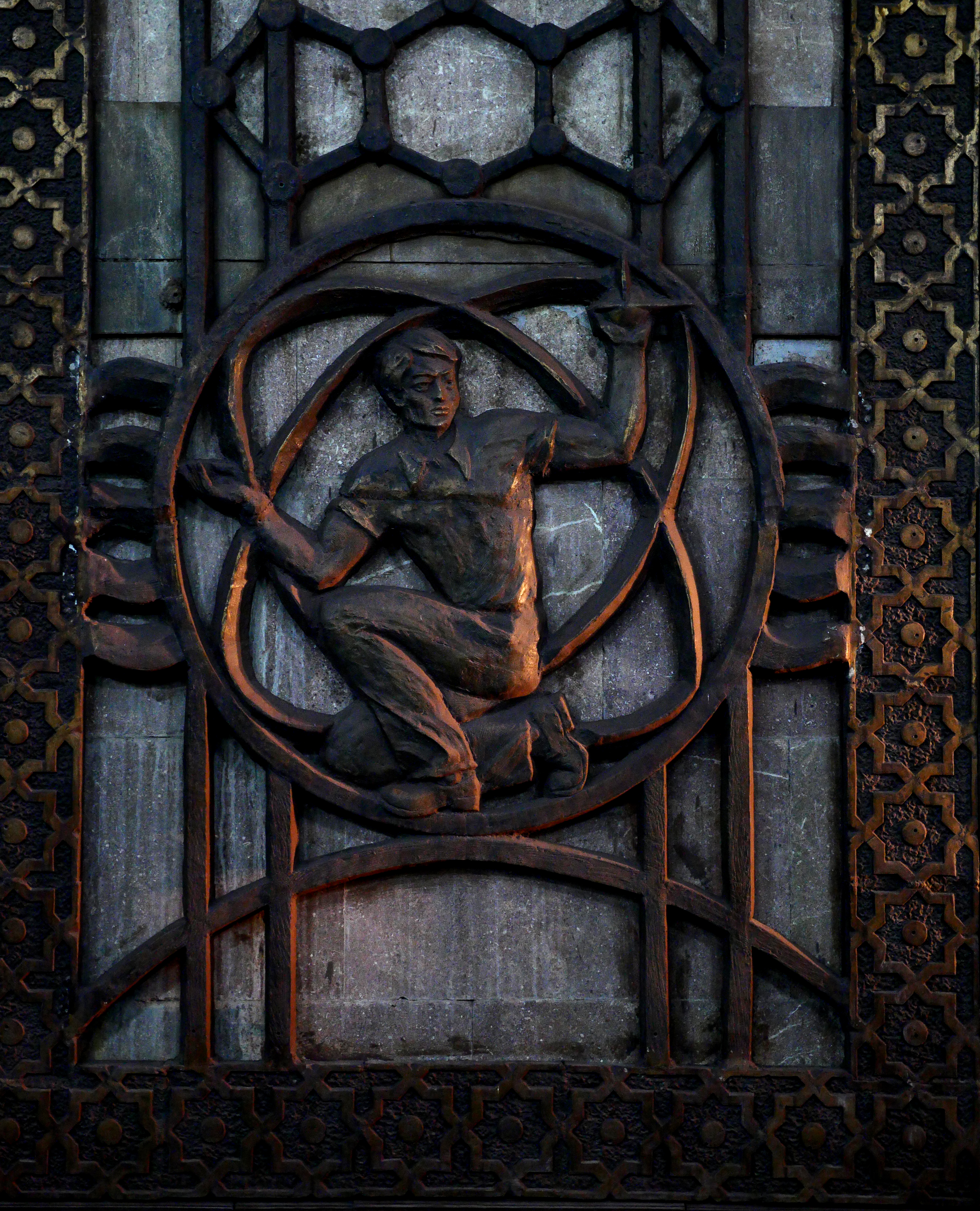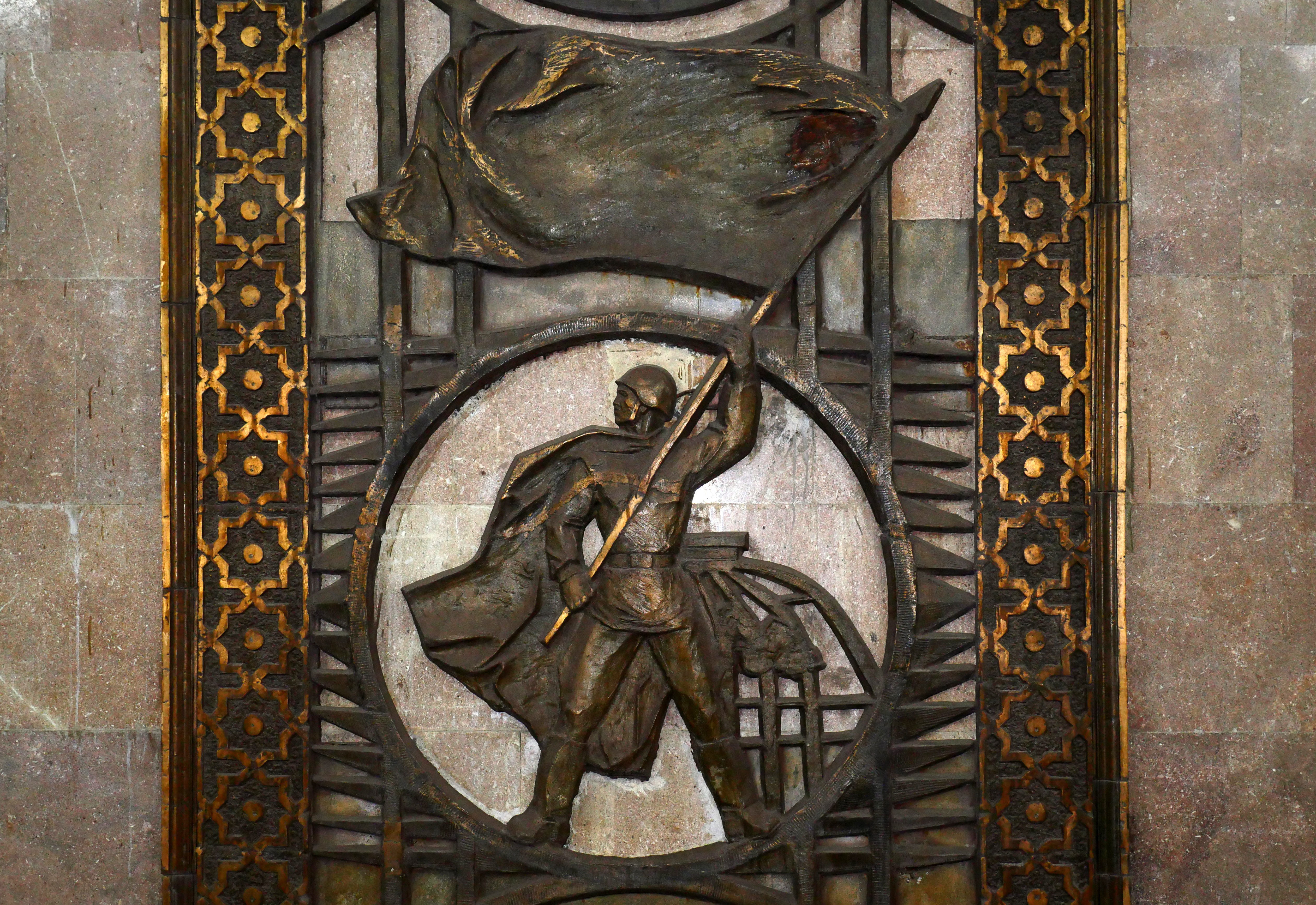 A wall relief shining in the glow of an approaching Metro car’s headlights in Milliy Bog (National Park) station.