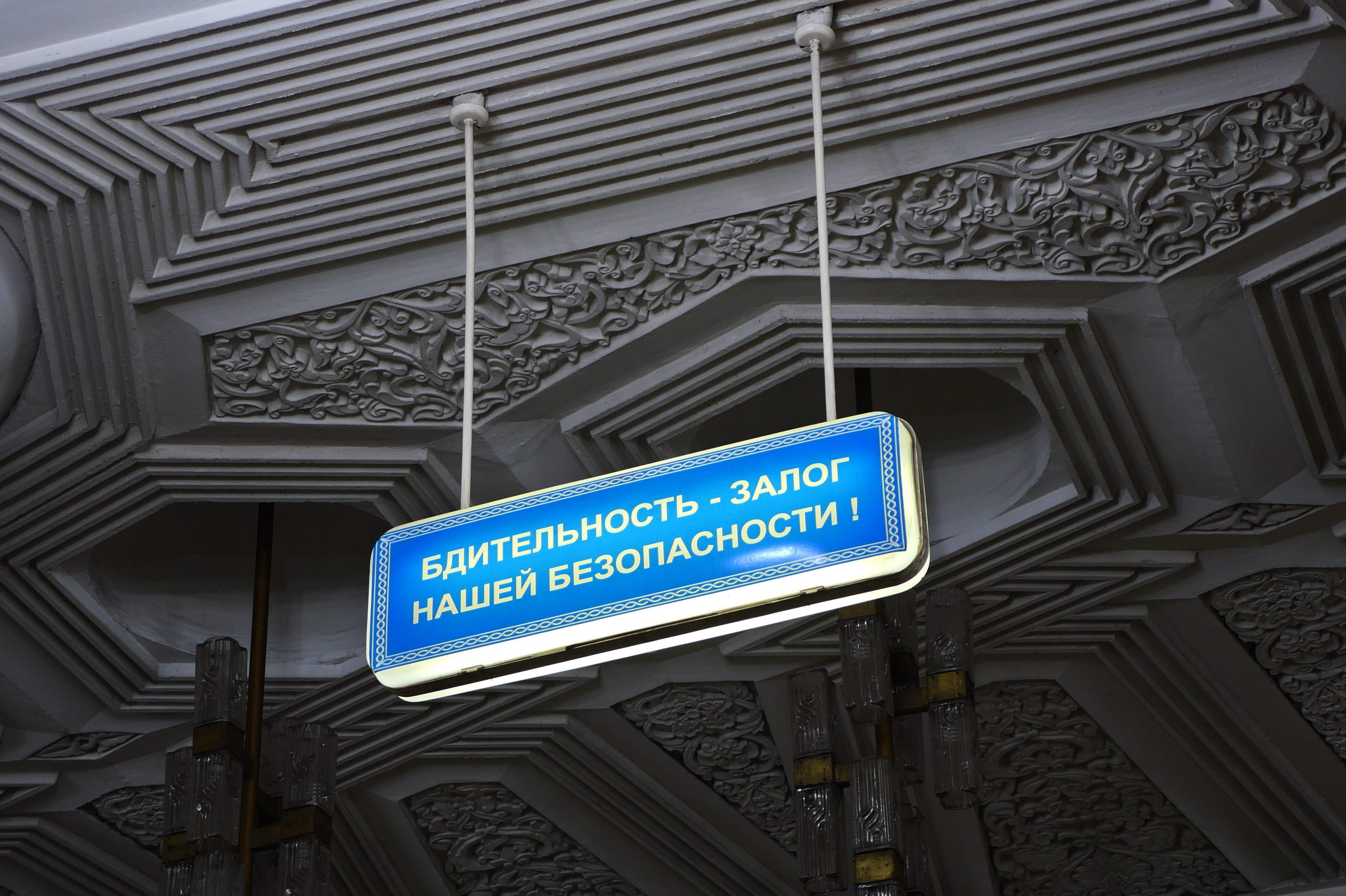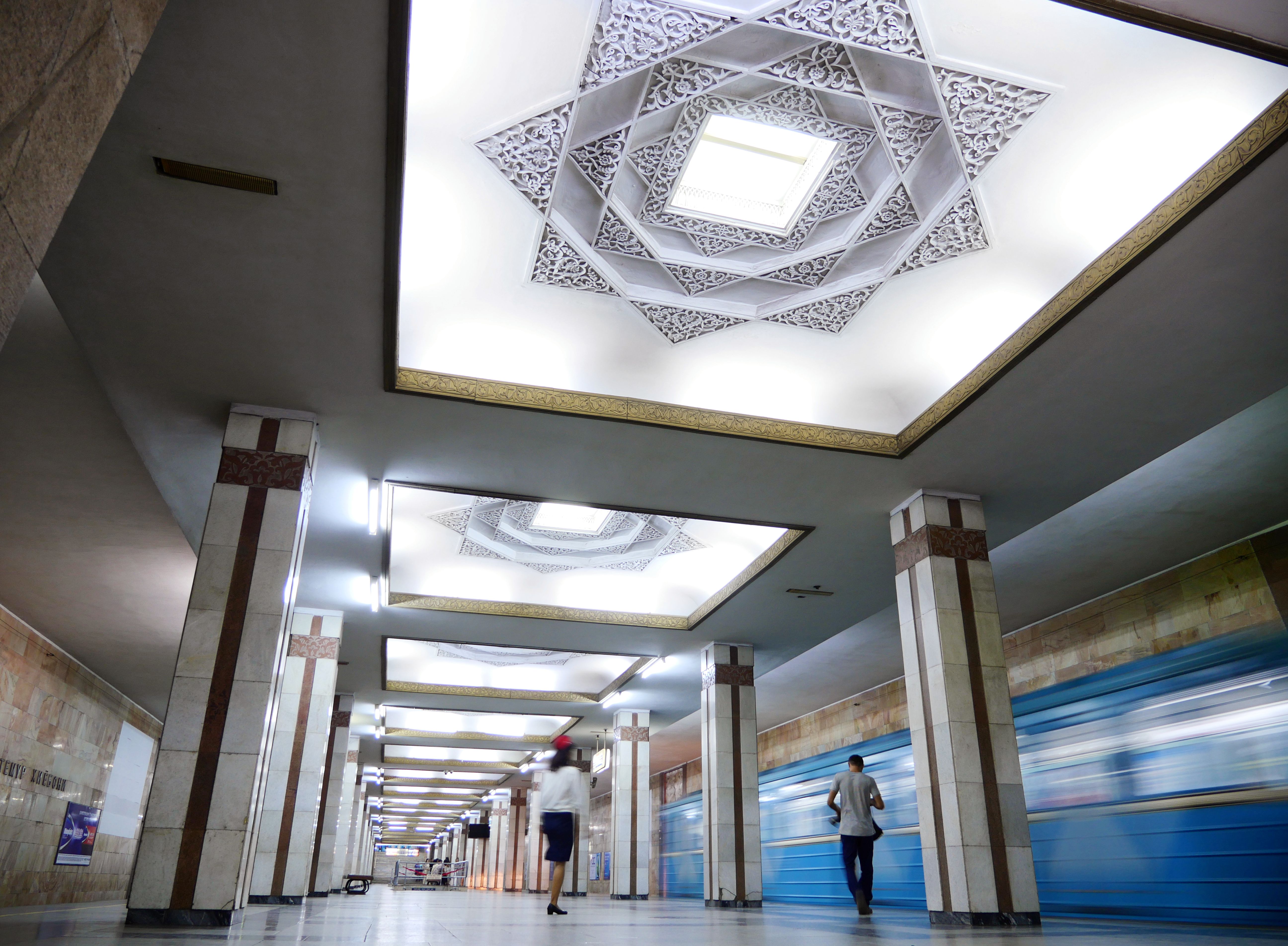 A Metro car rumbles into Novza station, named after a region of Tashkent. The underground mostly operates similar cars to the Moscow Metro, a model known for its screeching roar when driving at speed.