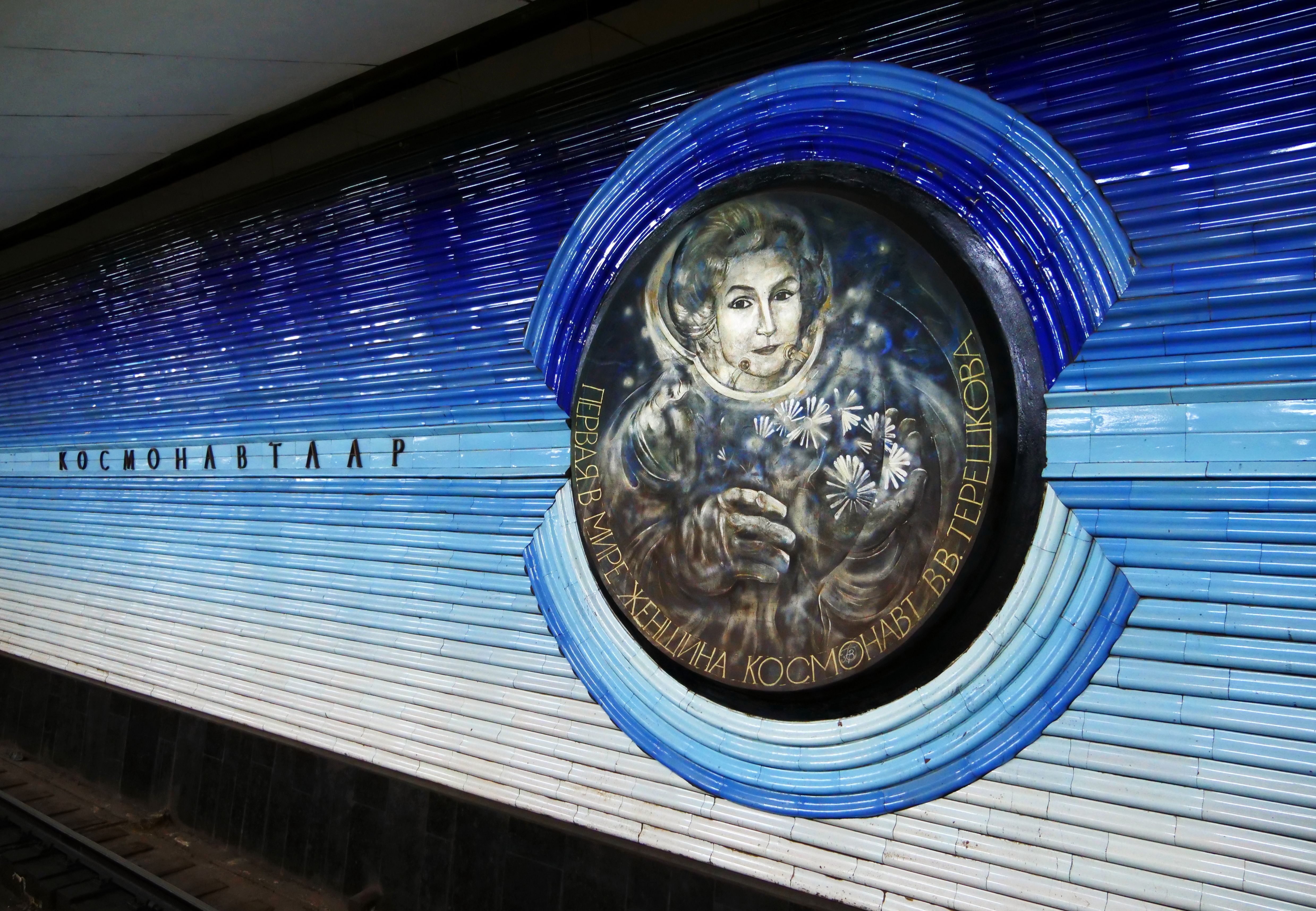 Valentina Tereshkova, the first woman in space, immortalized in Kosmonavtlar station. The ceramic wall panels fade from blue to black in imitation of Earth’s atmosphere.