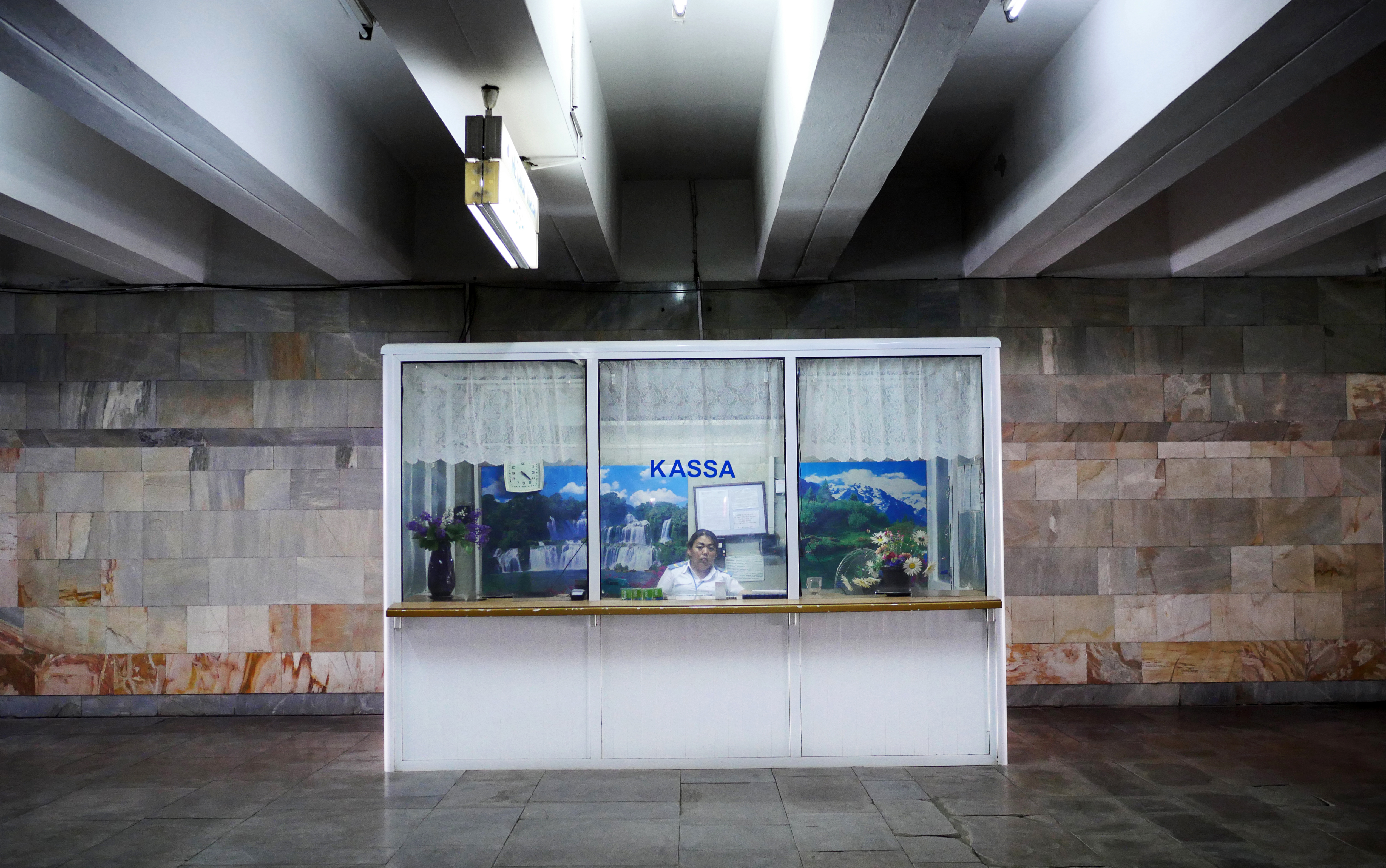 A cashier at an entrance to the Metro. A trip costs 1,200 Uzbek soms, the equivalent of $0.15, making it the cheapest subway ride in the former U.S.S.R.