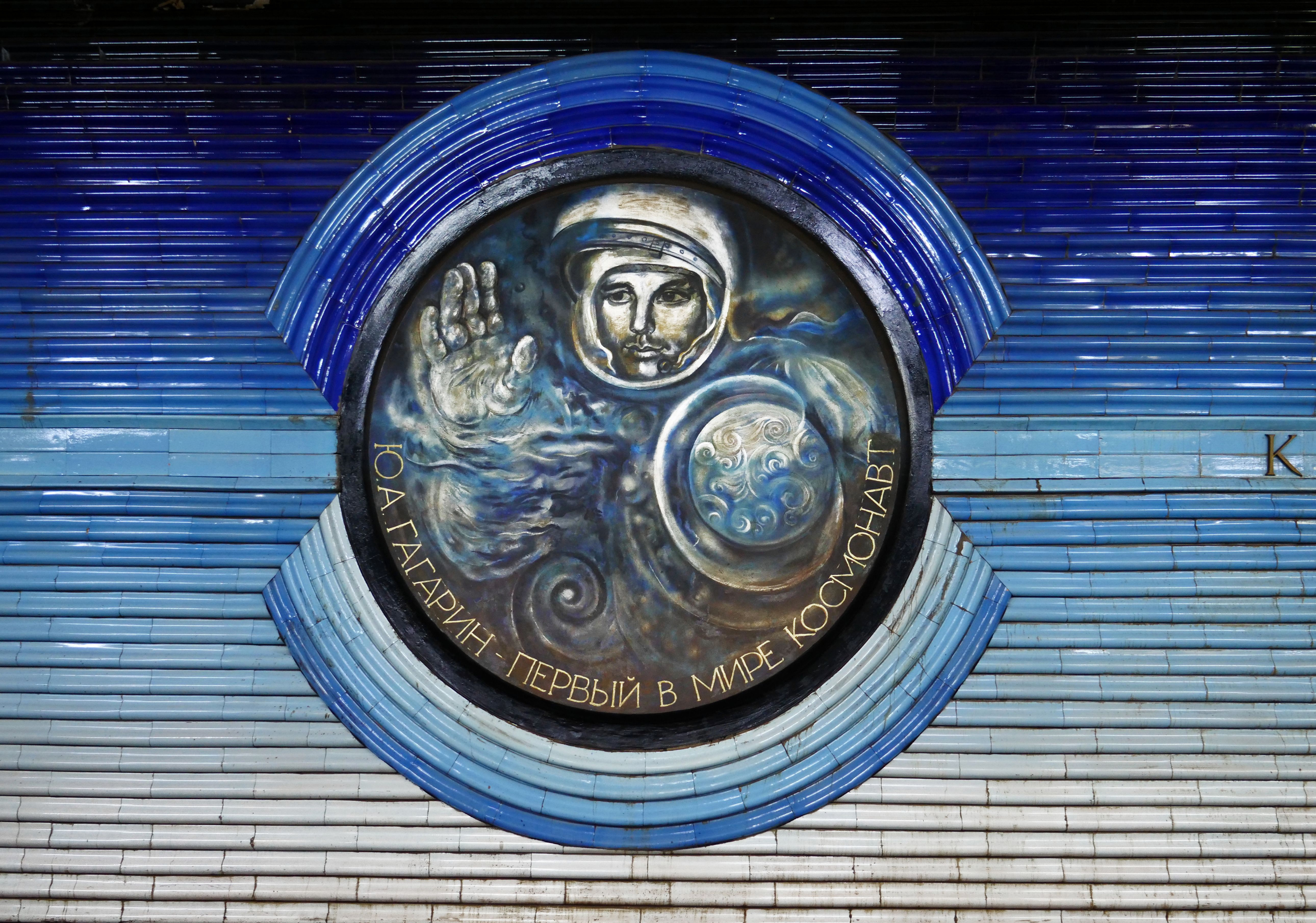 A portrait of Soviet cosmonaut Yury Gagarin, the first man in space, in Kosmonavtlar station.