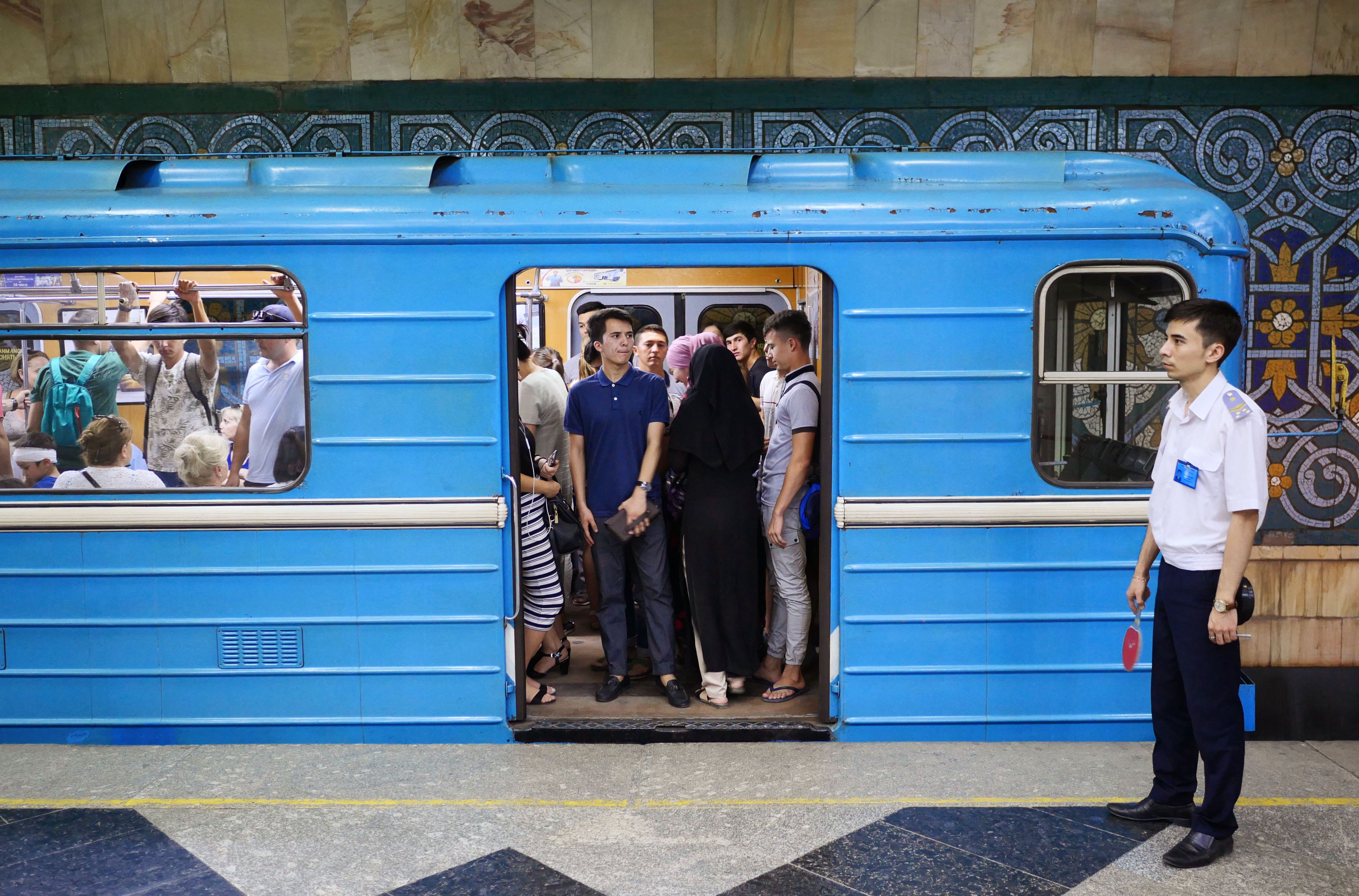 Passengers squeeze into a carriage in Pakhtakor (Cotton Worker) station.