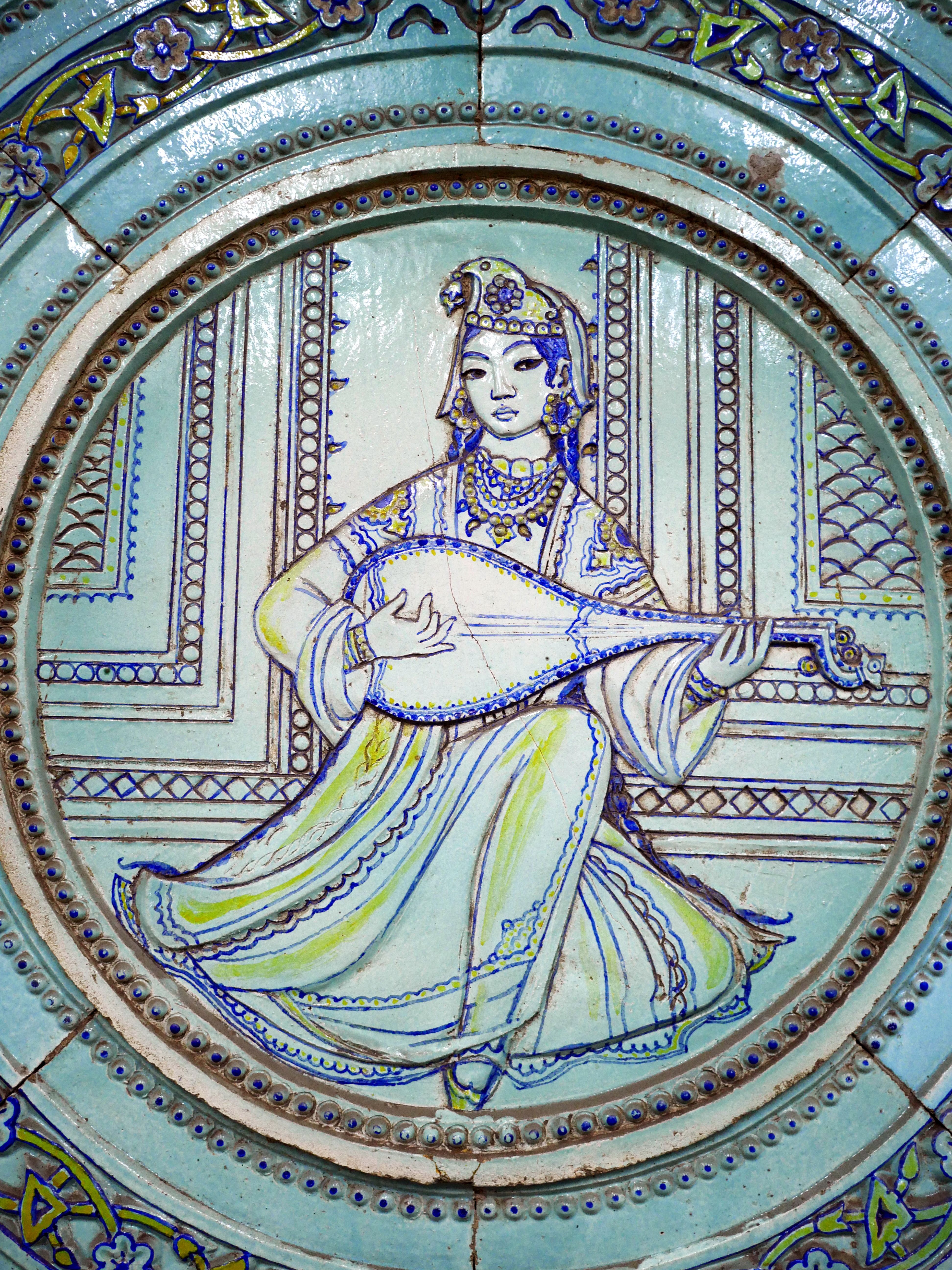 A ceramic panel depicting a woman playing a lute inside Alisher Navoi station.