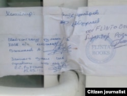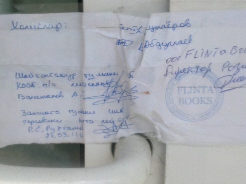 Photos sent to RFE/RL show the door to one of the stores, Flinta Books, taped shut with a paper seal bearing the signatures of an Interior Ministry officer, an NSS officer, and the store's director.