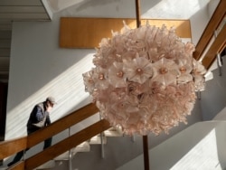 Sun-themed art stands inside the facility, which has its own bomb shelter.