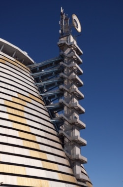 An elevator shaft at the rear of the concentrator. The dish at the top is an architectural flourish and has no technical function.