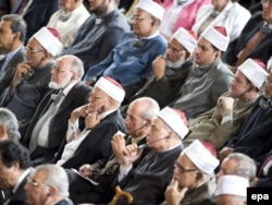 Audience members listen to a translation through headphones of U.S. President Barack Obama's speech at Cairo University in June 2009