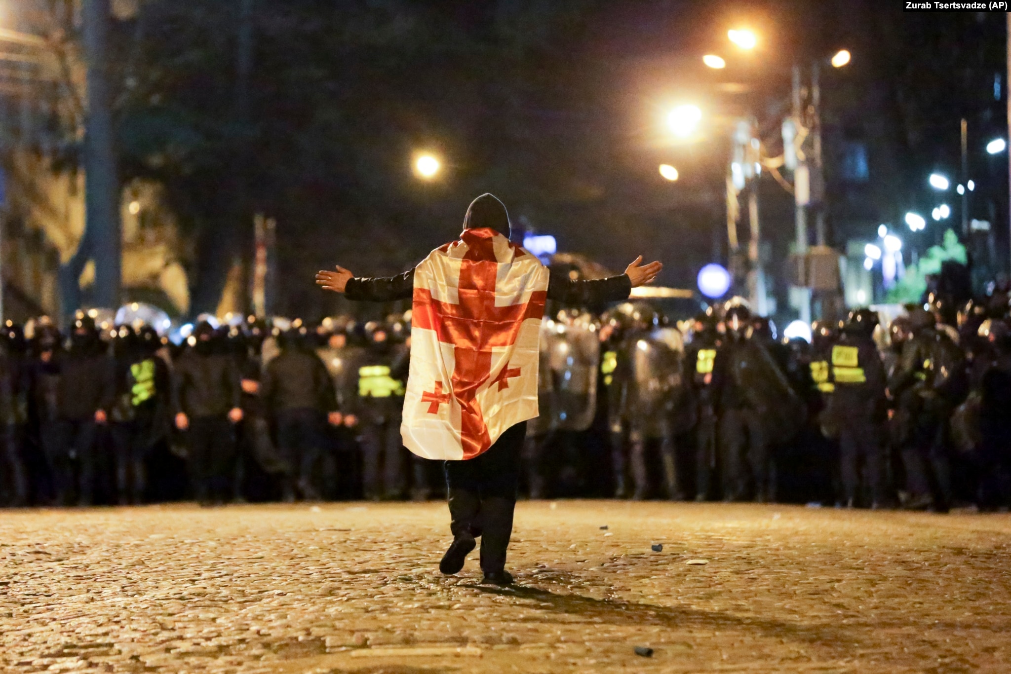 The nighttime photo shows a protester wearing the red-and-white Georgian flag like a cape and standing on a cobblestone street facing a thick crowd of riot police.