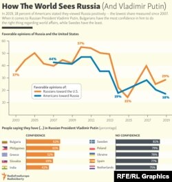 Poll results published by the Pew Research Center on February 7 showed that a mean of 60 percent of people in 33 countries covered by the survey said they have no confidence in Putin to do the right thing when it comes to world affairs.