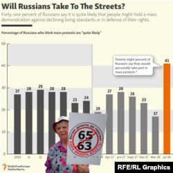 Poll results released on August 1 showed that 28 percent of Russians would take to the streets if protests against falling living standards and in defense of their rights were held in their hometown – more than at any time since September 1998, in the midst of a devastating financial crisis.